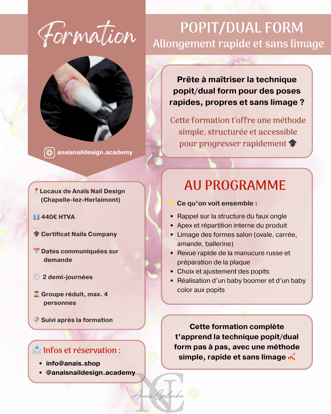 📬 Si tu as des questions ou que tu veux connaître les dates de la prochaine session, écris-moi à info@anais.shop. Si tu préfères, envoie-moi simplement un petit DM sur Instagram @anaisnaildesign.academy, je te répondrai avec plaisir.